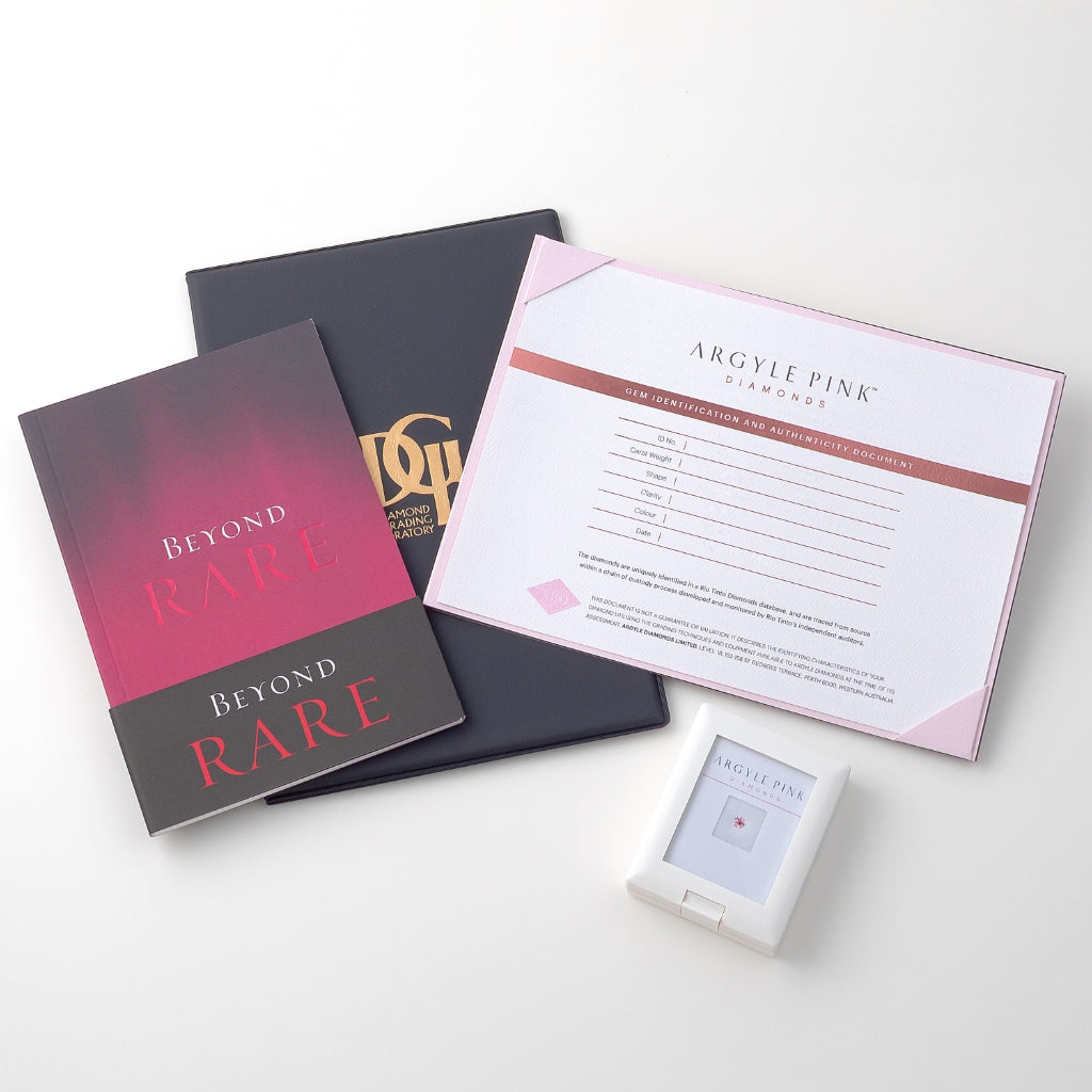 国際的に認められたアーガイルのピンクダイヤモンド・グレーディング・システムでは、色相、トーン、そして最も重要な彩度の3つの要素が評価されます。ガードルにはシリアル番号がレーザー刻印され、同梱されるアーガイル社の鑑定書は唯一無二で再発行はされません。弊社でG.I.A.グレーディング・システムに準拠したDGLのDiamond Grading Reportもお付けいたします。
