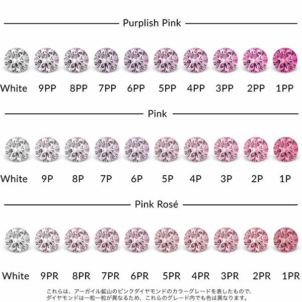 ダイヤモンドの主要な色。時には、色相に影響を与える修飾色を持つ場合があります。例えば、紫がかったピンクの色相はPurplish Pinkと呼ばれます。右チャート以外の色相としてPink Champagneとさらに希少なBlue Violet、Redもあります。